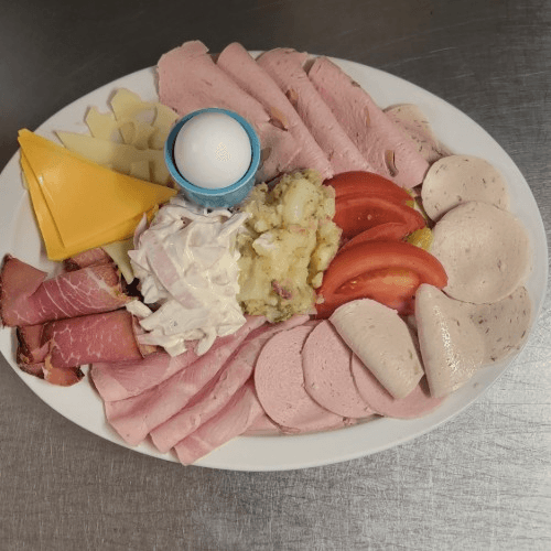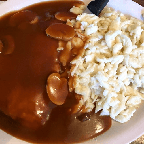 A generous slice of prime beef basted with hot mustard, filled with hickory smoked bacon, diced onions and baked to tenderness, served with delicious spaetzle and gravy