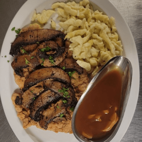 Topped with mushroom and gravy, spaetzle or choice of potato
